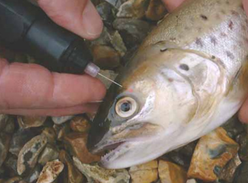 可見植入性橡膠魚類標(biāo)記線(VIE)由兩部分硅有機樹脂材質(zhì)組成,在使用前混合。VIE標(biāo)記線注射之前是液體,注入體內(nèi)后很快變成適應(yīng)生物體的固態(tài)物質(zhì)。這些標(biāo)記線植入透明或半透明的組織下面,保持從外表可見。在許多兩棲動物身上,VIE標(biāo)記線甚至可以透過黑色皮膚觀察到。